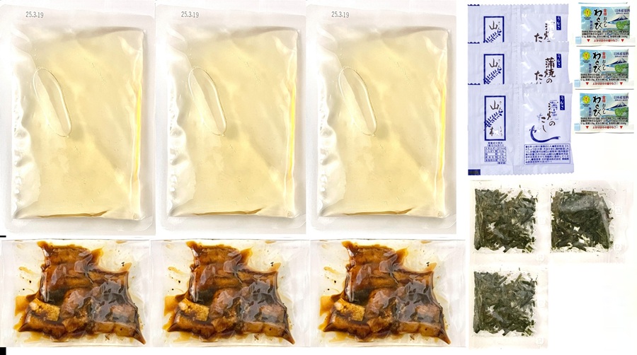 商品内容 | 愛知三河一色産うなぎ蒲焼きざみ45g・山椒付たれ・おろしわさび・刻みのり・吸い地(出汁)×各3 |