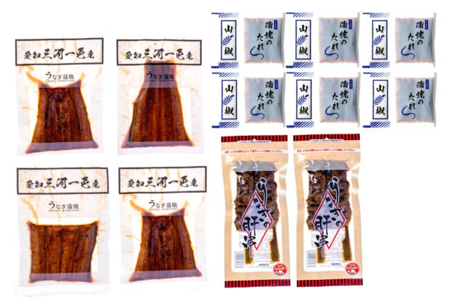 | 商品内容 | 愛知三河一色産うなぎ蒲焼 50g×4、愛知三河一色産 うなぎ肝串(2串)×2、山椒付たれ×6 |