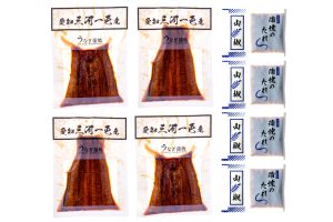| 商品内容 | 愛知三河一色産うなぎ蒲焼 50g・山椒付たれ ×各4 |