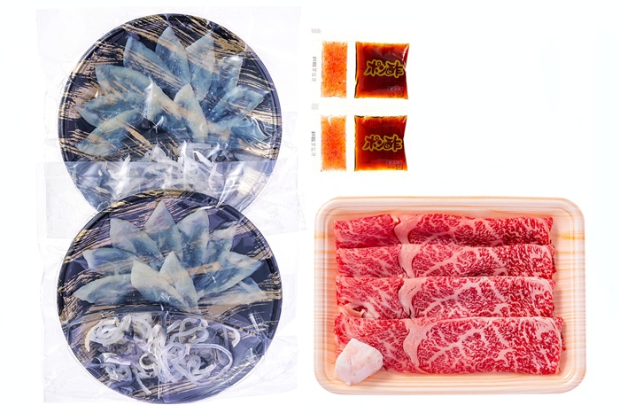 商品内容 | 【ふぐ刺身】国産とらふぐ(刺身15g・皮刺身10g)25g×各2 【飛騨牛すき焼き用】飛騨牛肩ロース肉すき焼き用150g |