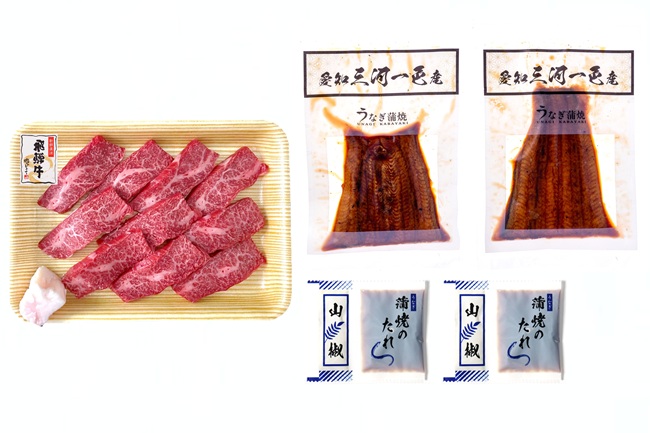 | 商品内容 | 【うなぎ蒲焼】愛知三河一色産うなぎ蒲焼50g、山椒付たれ×各2 【飛騨牛すき焼き用】飛騨牛ばら焼肉用150g |