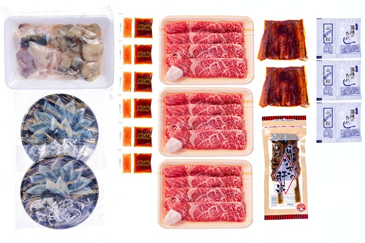商品内容 | 【ふぐちり鍋セット】ちり(国産とらふぐあら150g・国産まふぐ切身150g)300g、ぽん酢もみじおろし×4 【ふぐ刺身】国産とらふぐ(刺身15g・皮刺身10g)25g・ぽん酢もみじおろし×各2 【うなぎ蒲焼・肝串】愛知三河一色産うなぎ蒲焼50g×2、山椒付たれ×3、愛知三河一色産うなぎ肝串60g(2串) 【飛騨牛すき焼き用】飛騨牛肩ロース肉すき焼き用150g×3 |