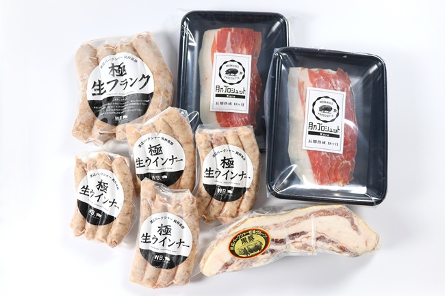 | 商品内容 | 黒豚 長期熟成生ハム30g×2、黒豚ベーコン300g、黒豚生ウインナー25g×4、黒豚生フランク80g×4 |