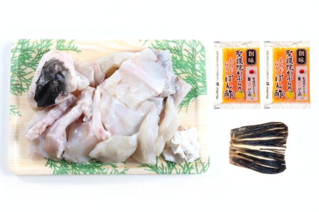 | 商品内容 | 天然とらふぐ焼ふぐ用(あら・切身・皮)200g、聖護院かぶらのもみじおろしぽん酢15g×2、ヒレ酒用とらふぐヒレ1枚 |