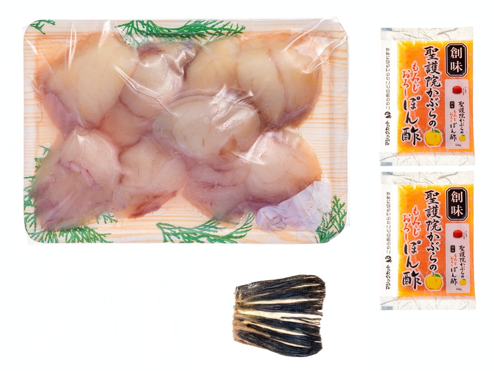商品内容 | 天然とらふぐちり鍋用(とらふぐあら・とらふぐ切身・皮)200g、とらふぐヒレ1枚、聖護院かぶらのもみじおろしぽん酢15g×2 |