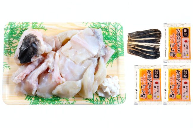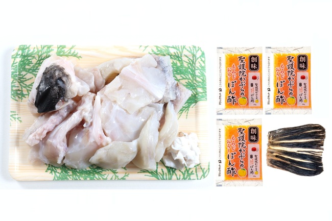 水揚げされたばかりの新鮮な天然とらふぐを、てっちり鍋用でご用意しました。切身と皮、アラを使いやすい冷凍パックにし、「聖護院かぶらのもみじおろしポン酢」、ヒレ酒用の「ヒレ」もセットにしてお届け。仕上げには、ふぐの旨味たっぷりの出汁で雑炊をお召し上がりいただくのがおすすめです。