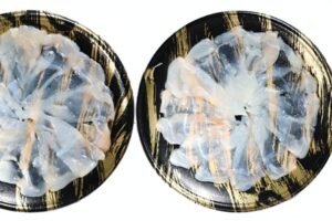 水揚げされた天然とらふぐをすぐに加工し、スライス状にして急速冷凍しています。さっと焼いて、凝縮されたふぐの旨味をお楽しみください。